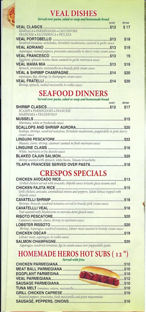 Crespos's Express offers a diverse and hearty menu that caters to a wide range of tastes. Their pasta specialties include dishes like Ravioli Marinara and Fettuccine Primavera, with prices reflective of their quality. The pizza selection features options such as the Plain Chicago and Supreme Deep Dish, as well as gourmet creations like Rapini Pizza and Cheesesteak Pizza. For those craving subs, they can choose from cold options like the American Hoagie or hot subs such as Chicken Parmigiano Vodka. The restaurant also offers satisfying sides, including Meatballs and Roasted Potatoes, along with crispy calzones like the Trio Calzone. If you’re in the mood for something unique, the Mango Habanero Chicken is a standout among the hot subs and burgers. For a lighter option, the Chicken Avocado Salad and Tuscan Caesar Salad provide a refreshing bite. Those with a sweet tooth will enjoy the tempting dessert selection, including Cheesecake and Chocolate Lava Cake. Whether you're stopping in for a quick meal or catering an event, Crespos's Express delivers flavorful and satisfying dishes that are sure to please every palate.